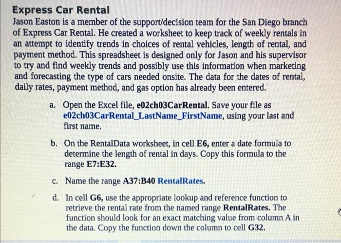 O Student Data File Needed E02ch03carrental Xlsx You Chegg Com